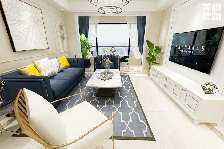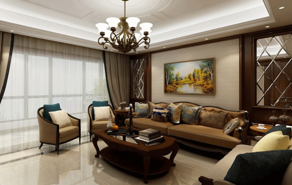 中心色为酒红色、蓝色和金色,沙发用酒红色,地毯为暗土红色,墙面用明亮的米色,局部点缀金色,如镀金的壁灯,再加一些蓝色作为辅助,即成华丽清新格调。