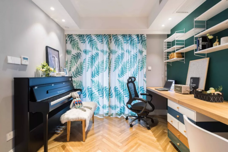 位于客厅沙发背后的书房空间,灰色和青色的墙面形成对比,把钢琴和书桌区域给分开,墙面的置物架搭配双人书桌的设计,满足了书房的收纳需求。