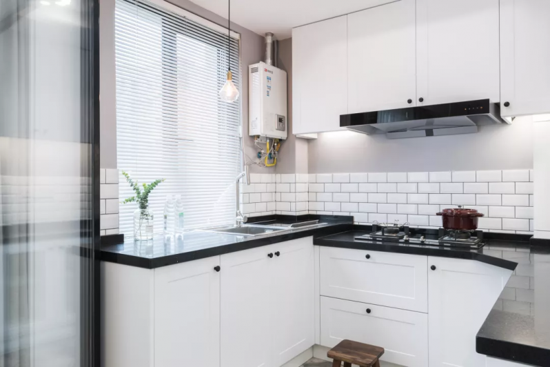 厨房内部是U字型的橱柜布局,白色的柜体、黑色的台面和小白砖、花砖、灰色墙漆的运用,让厨房的层次分明,折叠门的使用也让厨房平时更显宽敞。