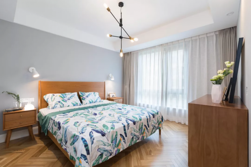 卧室内温馨原木与清新被单的搭配相得益彰,一盏简约吊灯,简单明了的同时营造出自由舒畅的卧室氛围。