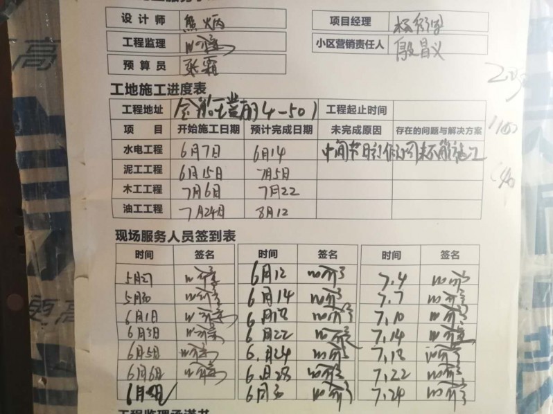 一上楼就发现门上挂着施工规范和装修日记,每天都有施工记录,标注得非常清晰,施工工人和项目负责人对工地的认真负责的态度让人安心。