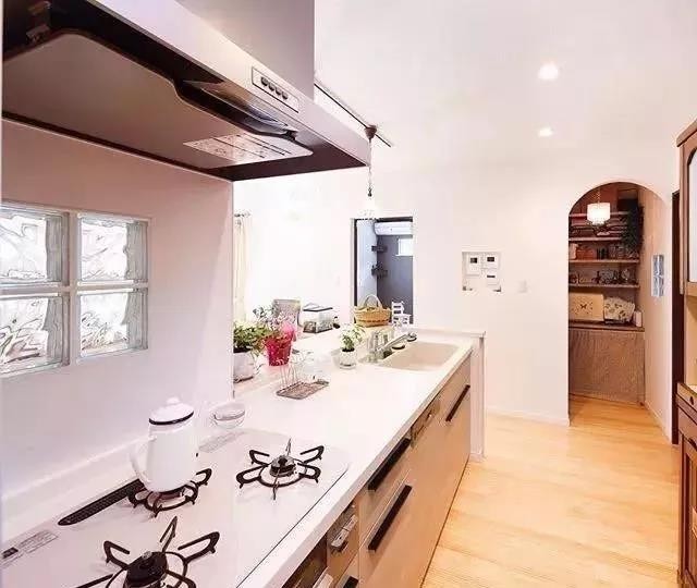 在橱柜的上方设置玻璃窗,虽然采光变好了,也会担心玻璃上喷溅的水渍和油渍会影响厨房外部的美观度,而玻璃砖就不会有这方面的困扰,即便内侧的玻璃有点污渍,经过双层玻璃的折射,外部也依旧闪亮亮的,看不出来