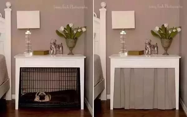 △一款隐藏式宠物窝,保持家具的造型只留一个小小的入口即可。如果不喜欢木色,也可以刷上白色的染料,除了充当宠物窝外,还可以用来摆放绿植哦。