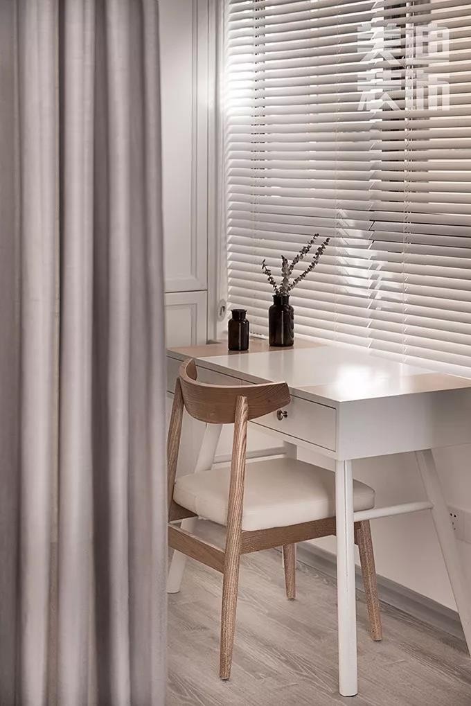 ▲实木智能整装·书桌丨折叠百叶窗、整面墙的收纳柜搭配简单的书桌,自然而亲切。色调上,设计师始终保持了不同灰色的主调色系,使整个空间明亮而清爽。