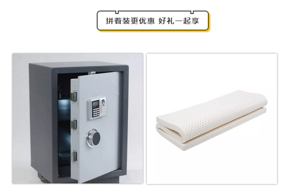 两人及两人以上成团签单,即可享受“拼客体验”优惠。两人拼客成功每人赠送智能保险箱1个;四人拼客成功每人送价值3880元橡胶床垫一个。