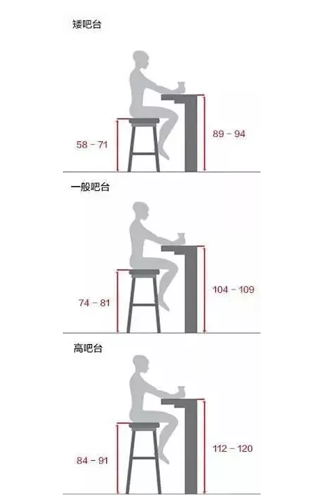 说完吧台设计之后再给大家科普一个小知识,即不同高度的吧台和吧椅的标准设计: