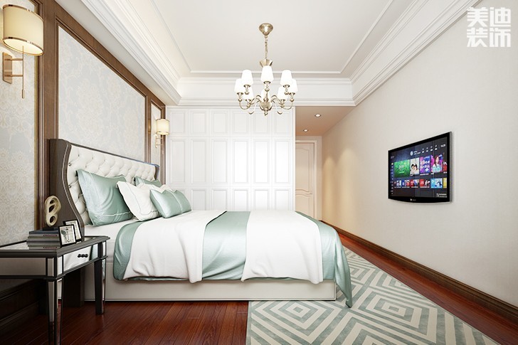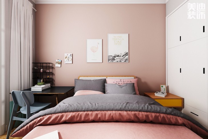 衣柜放置在与床相对的墙面,两件家具间的距离应该是90厘米最为合适,这个距离既能方便打开柜门,又不会被绊倒在床边。