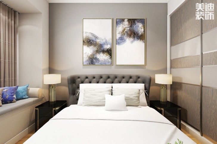 两张并排摆放的床,彼此间的距离应是90厘米。除了满足放下两个床头柜的需求,还要考虑到两个人的行动空间。床的外侧距离也不要忽视,以便不影响清洁地板和整理床上用品。
