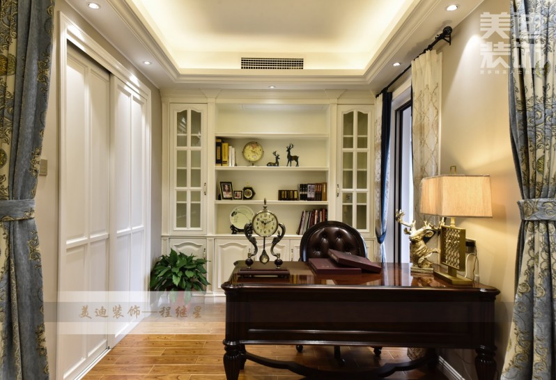 △质感厚实的书桌和美式座椅,深棕的色调看起来严肃且庄重,静谧中散发出书卷香,书桌上复古摆钟和装饰品成为亮点。简单的白色书柜,摆放了书籍和相片框,少了点华丽多了点轻松随意。
