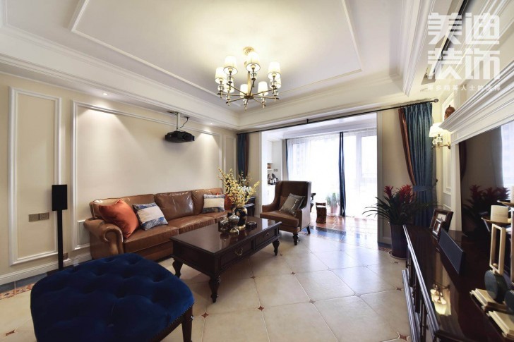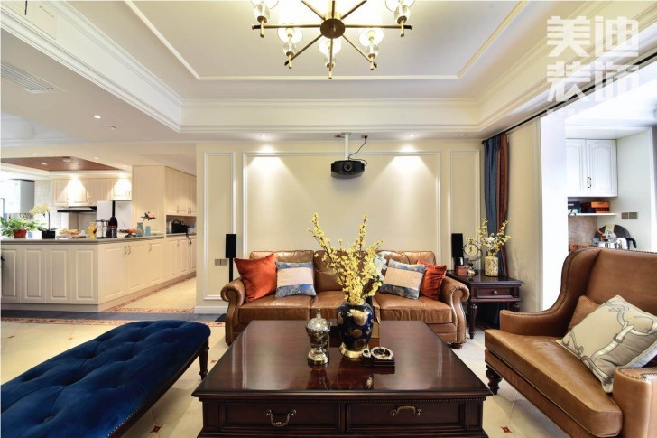 △沉稳厚重的茶几,质地柔软的棕色皮沙发优雅舒适,再加上橙色、蓝色丝绒抱枕的点缀,给人以温馨的感觉。