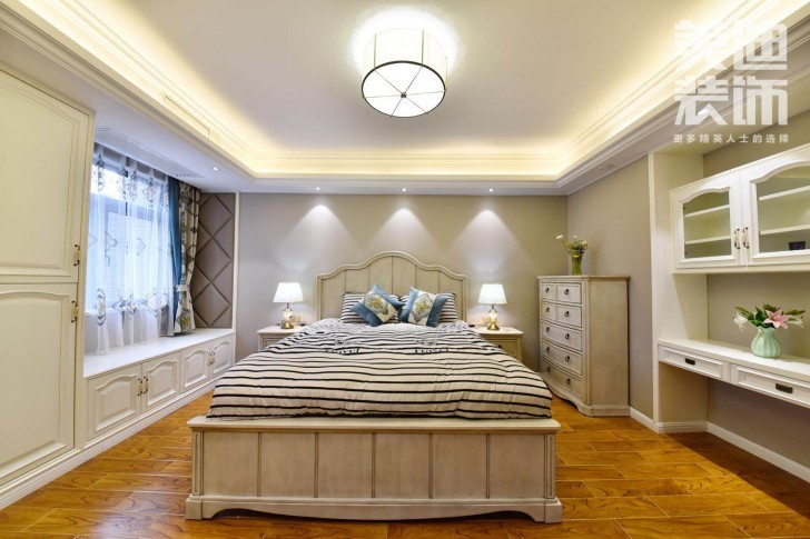 主卧既安装了飘窗柜,又将梳妆台与收纳柜、吊柜等结合起来,满足多种不同的需求,而且这样收纳柜也不会显得太呆板了。