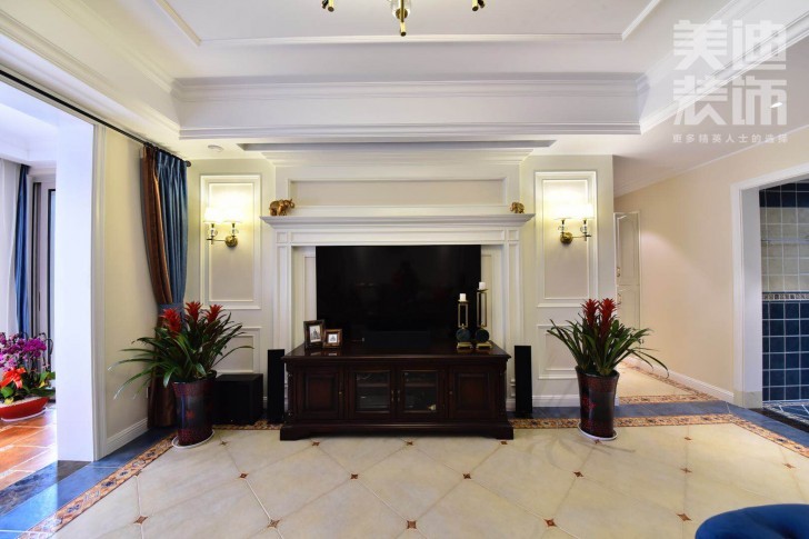 △电视背景墙以石膏线造型内嵌电视和电视柜,这样不仅色调和客厅整体风格相融合,还显得美观大气,将这块区域利用的淋漓尽致又不失设计感。