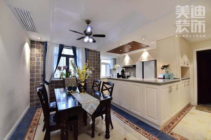 △餐厅和厨房的设计,是彭先生最喜欢的装修效果。餐厅与开放式厨房相邻,餐厅的瓷砖铺设很有复古的异域风情,花砖巧妙的划分了空间。深色餐桌与餐椅组合,配上精致的餐布和鲜花,整个餐厅看起来和谐也不失活泼、有情调。