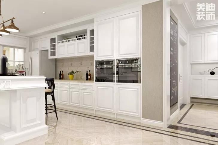 定制橱柜的上方最好直通天花板,不留空隙。不仅看起来更大气美观,还免去了清理橱柜顶部的麻烦。