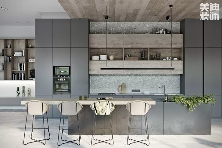 厨房餐厅可以采取开放式设计,除了可展示收藏的杯盘外,还可设计一个活动的工作台面,作为备餐台、或是烫衣板。