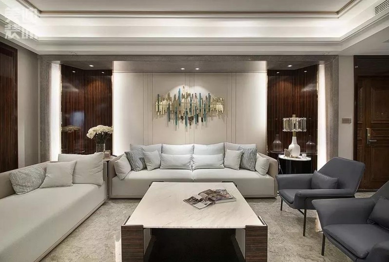 木质墙面,高级灰色调布艺沙发予人冷静安谧的视觉感受,整体设计透露出高级感,更加注重品质细节。