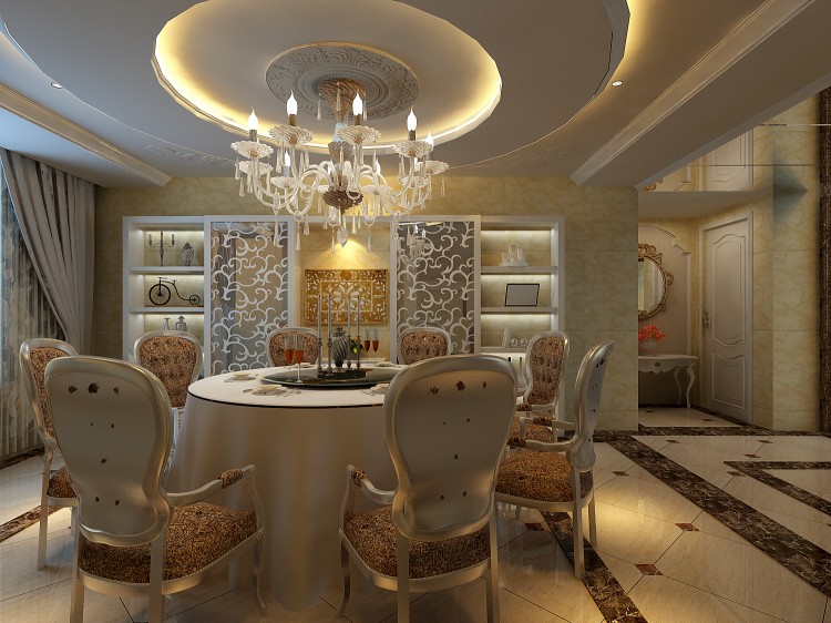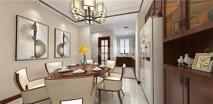 用镂空式屏风做玄关隔断,不仅可以提亮空间,延展空间视觉效果,增加空间的通风性,而且在屏风上还可以放置东西,增加空间的收纳功能。整个餐厅显得和谐宁静。