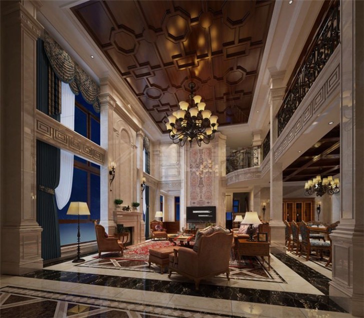 3、软装配饰。很多空间都很重视装饰和配饰,挑空的客厅更是需要通过装饰来达到效果,让客厅体现出业主的品味和风格格调。气质吊灯,就像女人为什么喜欢戴珠宝一样,一个挑空客厅也必须要有一款符合气质的吊灯。这样会拉升客厅整体格调。挑空客厅墙壁往往很高,不注意装饰会有太过于空旷的感觉,所以在设计的时候可以选择大气的背景作为装饰,可以做一整幅彩绘或主题墙。
