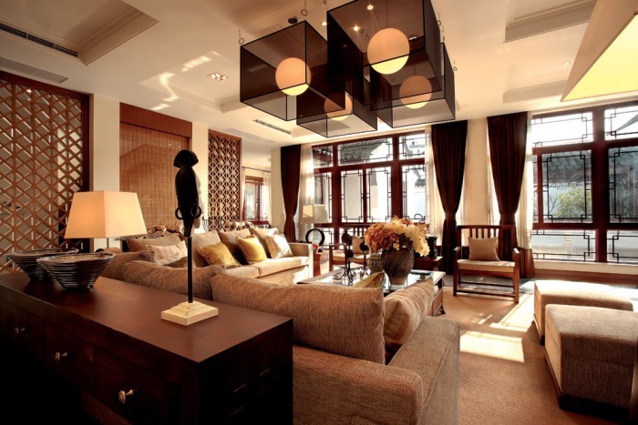 中式装修,在空间上非常讲究层次感,在能够隔绝实现的地方,往往采用窗棂或者屏风进行隔断,多以木构架形式为主,古色古香,给人的是一种沉稳、大气之感。