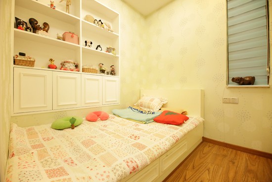 小户型的儿童房,因为空间更狭窄,如果墙面增加吊柜反而会适得其反,让空间变得更为逼仄,见缝插针使用嵌入式收纳柜,正好贴合墙壁,变得更实用,不会占用孩子的活动空间,也能将孩子的宝贝得到一一的展示,满足孩子好奇心,为孩子营造出整洁的玩乐天地。
