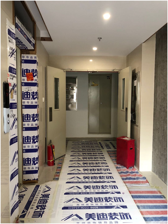 第一站,北辰三角洲E4区,这是一套面积为120余平米的房子,目前正处于水电验收阶段。一进门,便能看到贴有美迪装饰专用的保护膜,这属成品保护。它是保证装修品质的第一步,能对成品进行严格保护,预防二次破坏。