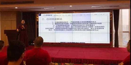 在大会上,我们的运营中心总经理兼总店店长高涧晖也特别强调道:“将 ‘放心家装,四项铁规’严格执行到位,让工地说话。”