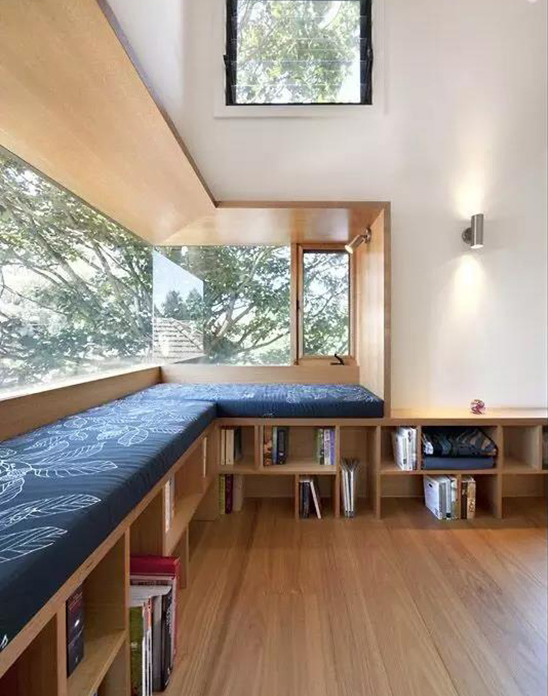 同时,飘窗的下面可以兼具了收纳的功能,放一些书、毯子等物品,随用随取。