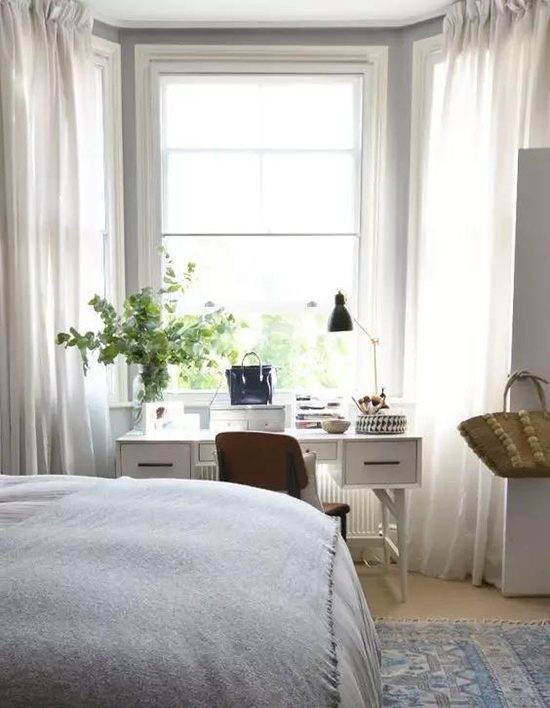 飘窗可以变身工作角,工作累了的时候抬头看看窗外,让眼睛放松一下。