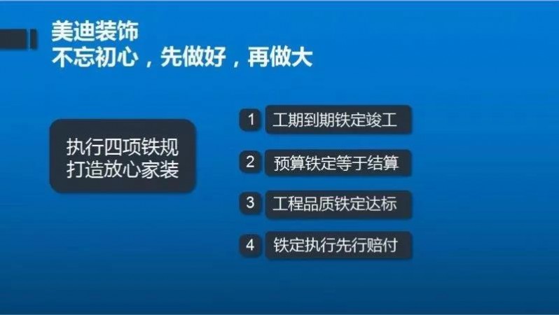 拒绝家装陷阱,把担心变成放心!美迪装饰率先推出先行赔付政策,严格执行四项铁规: