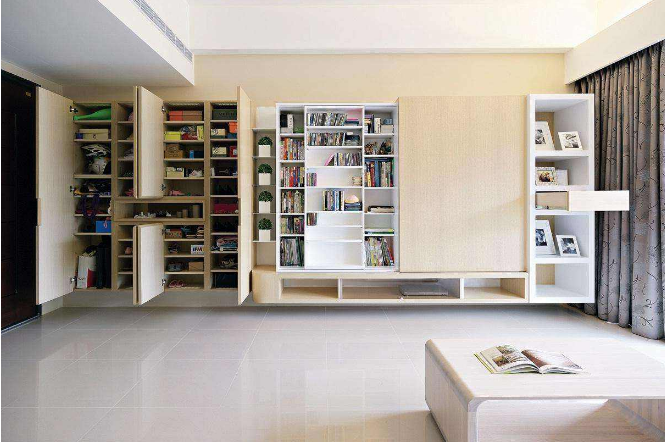 在进门处,可以适当增加一个收纳柜子,放置在鞋柜的上方,以便于放置一些常用的小物件,例如钥匙、雨伞、鞋刷等,方便日常出入门的拿取。另外鞋柜产品建议选择底面有一定缝隙的空间,便于鞋子的透气以及灰尘的掉落,方便我们日常的清洁打扫。
