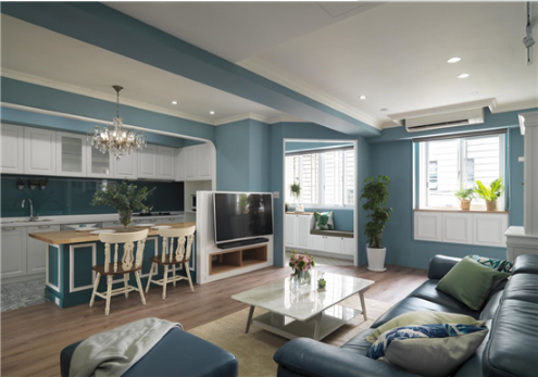 灰色爱上蓝色。灰色能够衬托蓝色的明亮,而蓝色能突显灰色的质感,再来一点黄色,点亮整个空间。