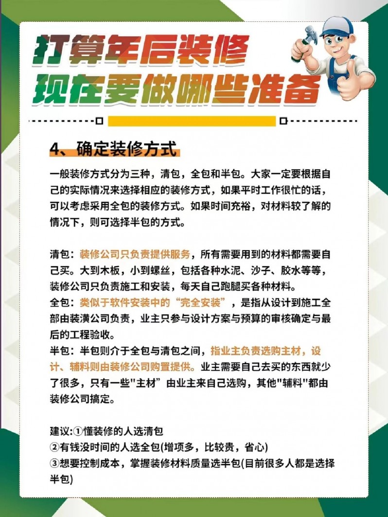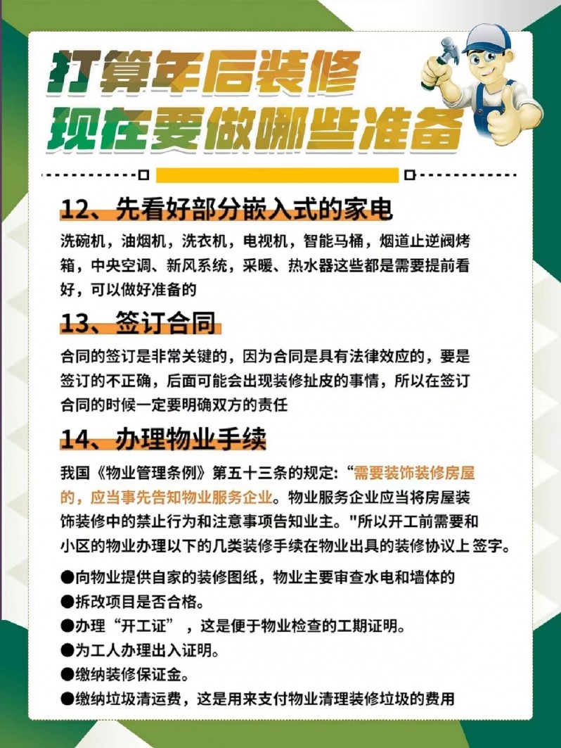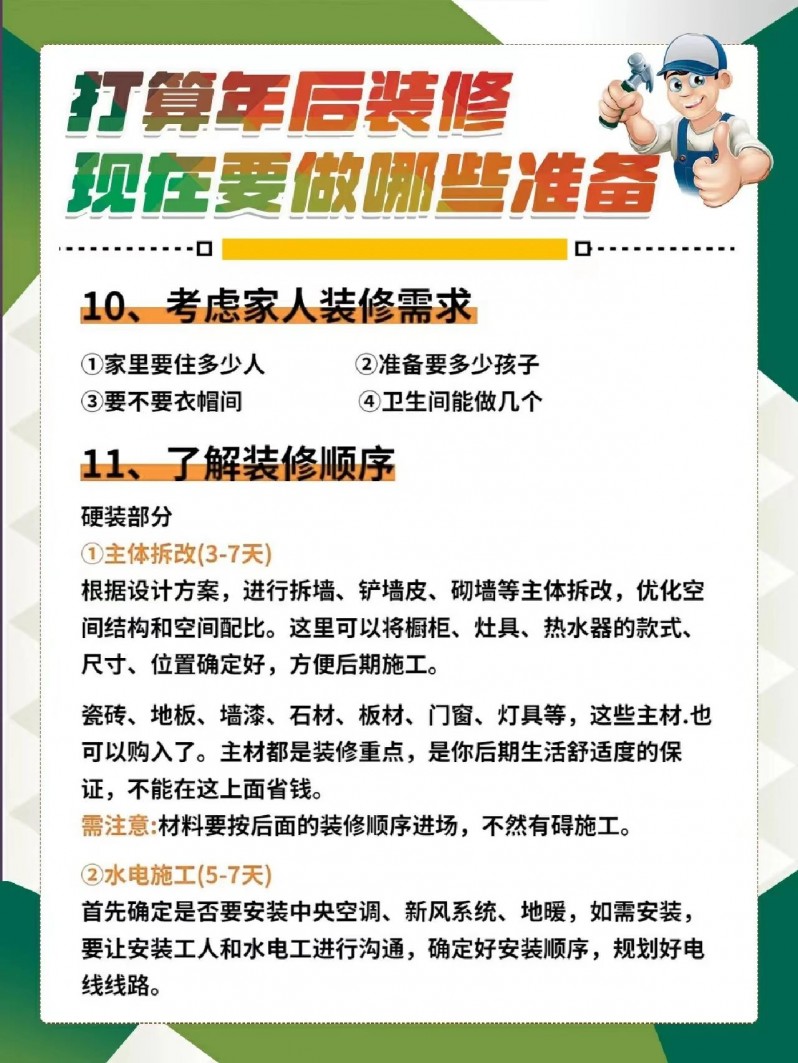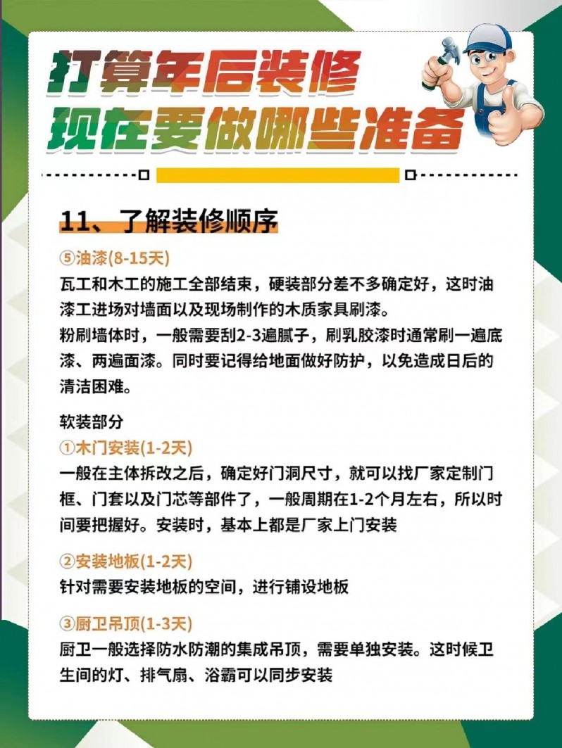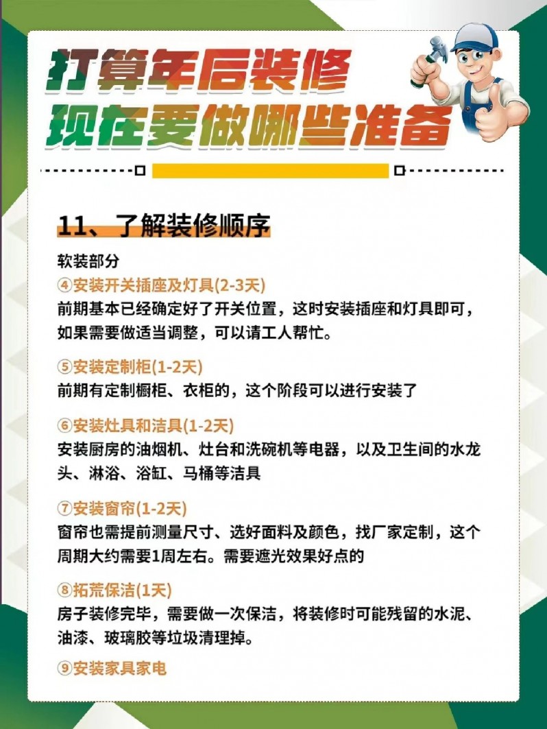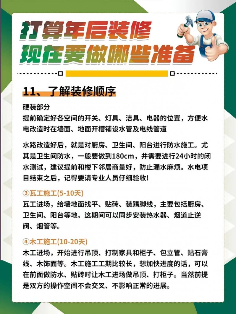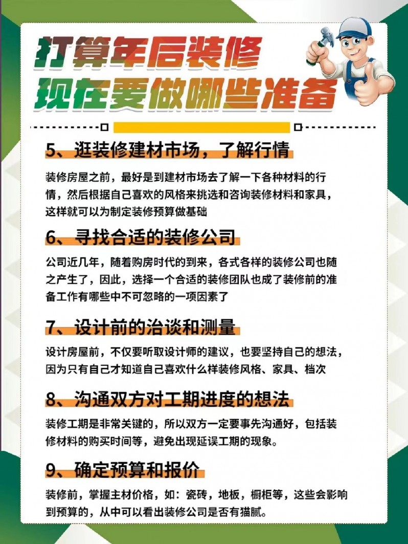 总之,如果大家准备年后就开工装修的话,一定要做好提前准备,尽可能的避免装修时因准备不足而犯错!