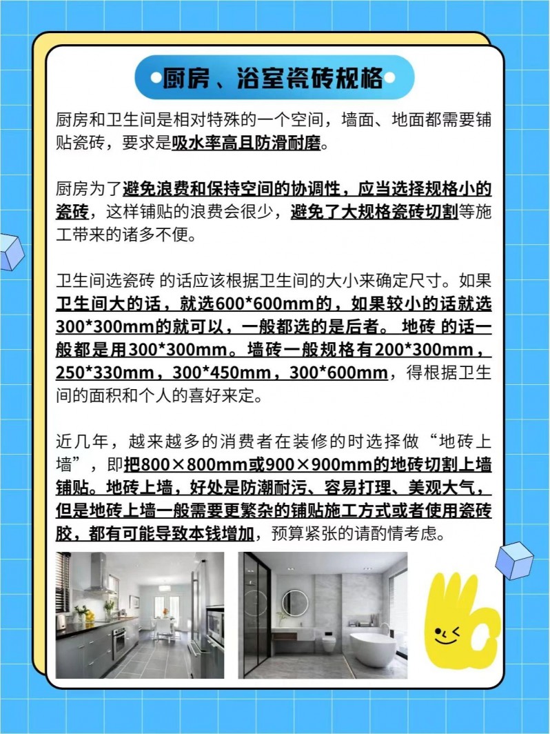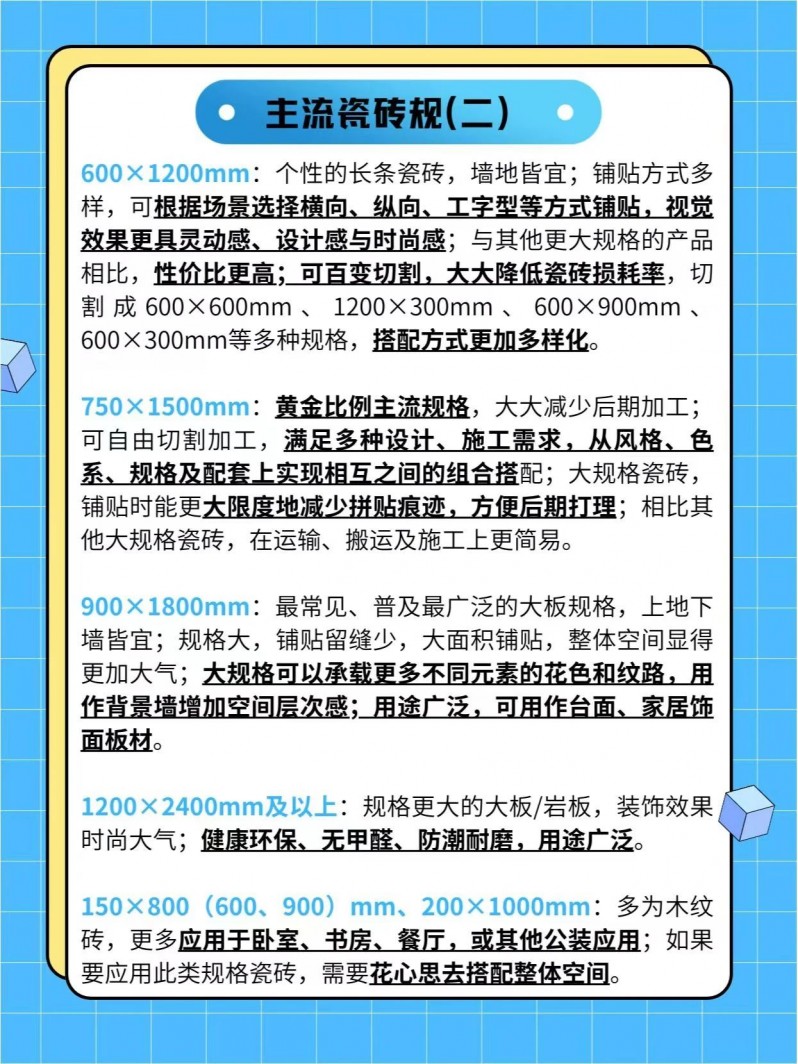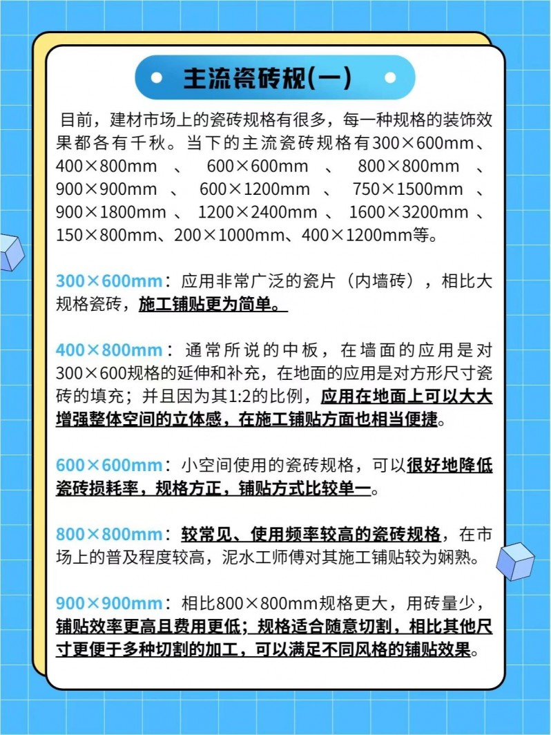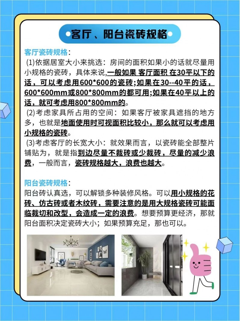 (4)瓷砖规格太大或太小可能会导致铺贴施工本钱以及运输搬运本钱增加。