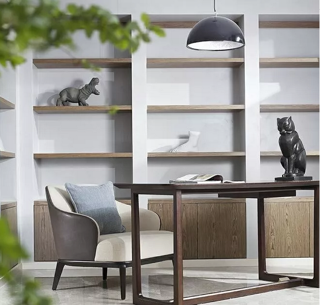 为了加强空间的互动性,设计师将书房与客厅之间打通,使得整个空间更为开放。源于业主有收藏艺术品的爱好,设计师还在书房间设置了整墙柜体,来作为业主的收藏区。