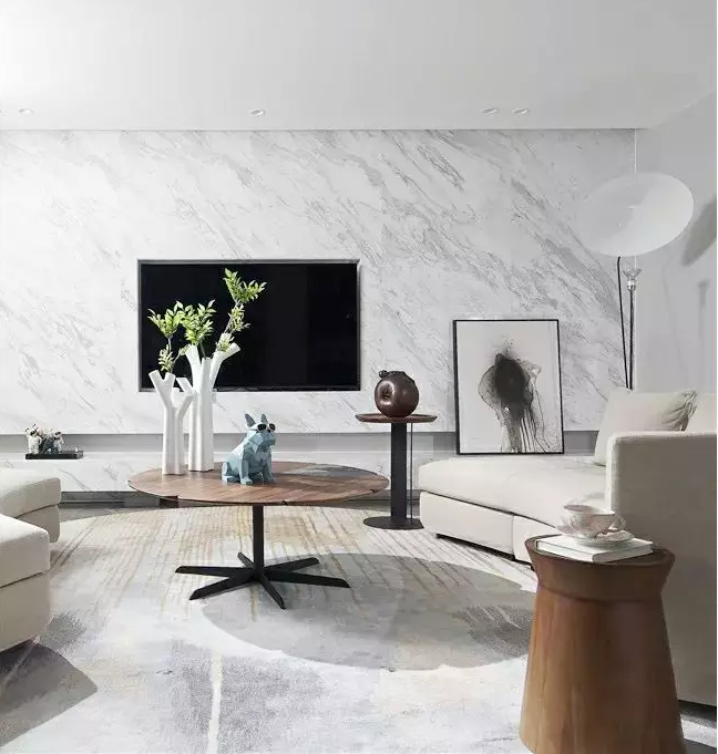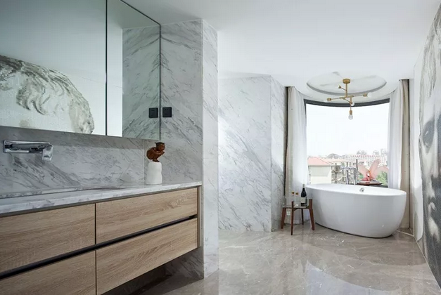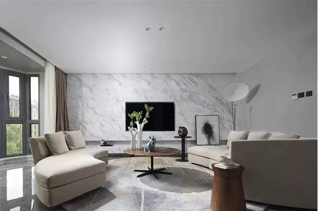 在整体的设计风格上,设计师摒弃多余的装饰,大面积使用了天然大理石、艺术漆与木材等材料,力求做到以少胜多、以简胜繁,呈现出生活的本真:自然。