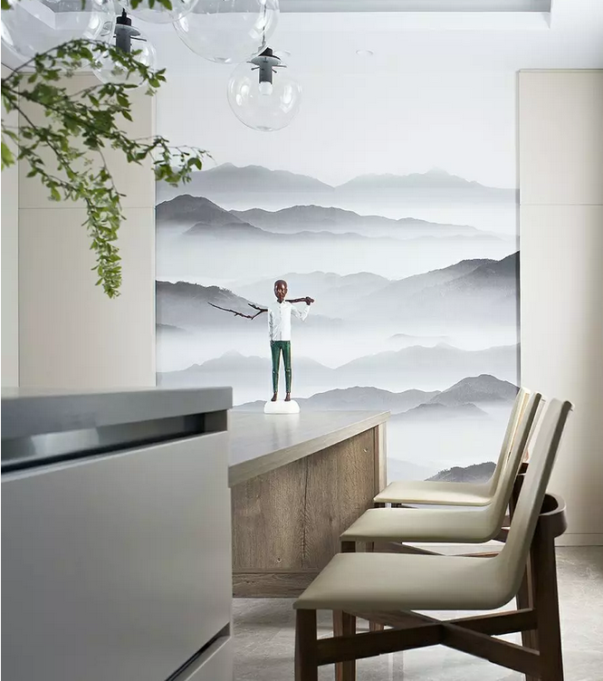 步入餐厅,一幅云雾缭绕、远山层叠的中国水墨画在空间中铺展开来,它与简洁的白色空间,相映成趣,再缀以一抹清新的绿意,田园牧歌式的生活即刻在眼前上演。