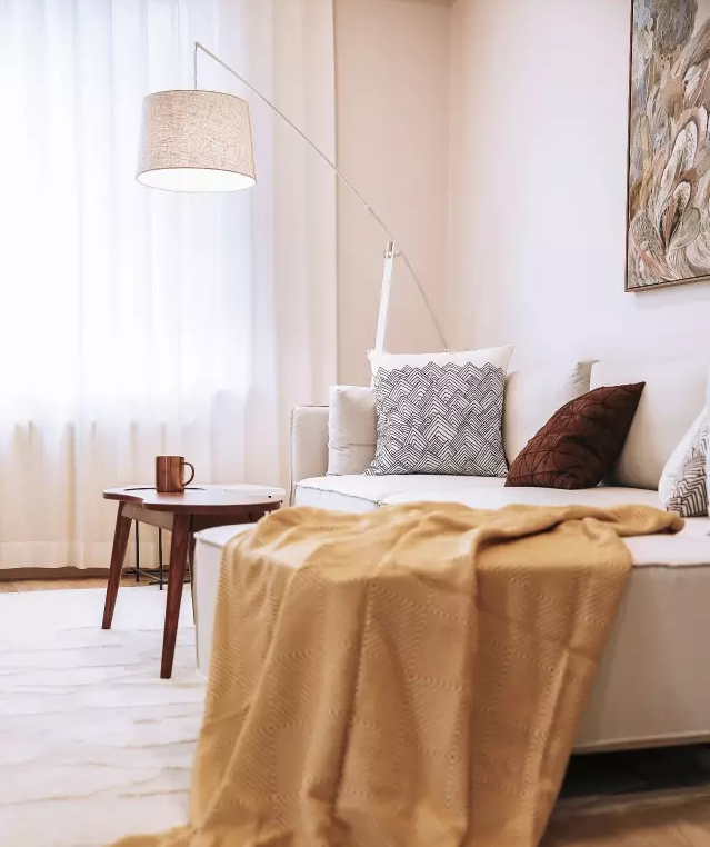 几何图案的抱枕,随意摆放的毛毯以及富有艺术感的装饰画,共同打破了纯白沙发带来的单调,既活跃了空间色彩,又呈现出了北欧风特有的随意自然。